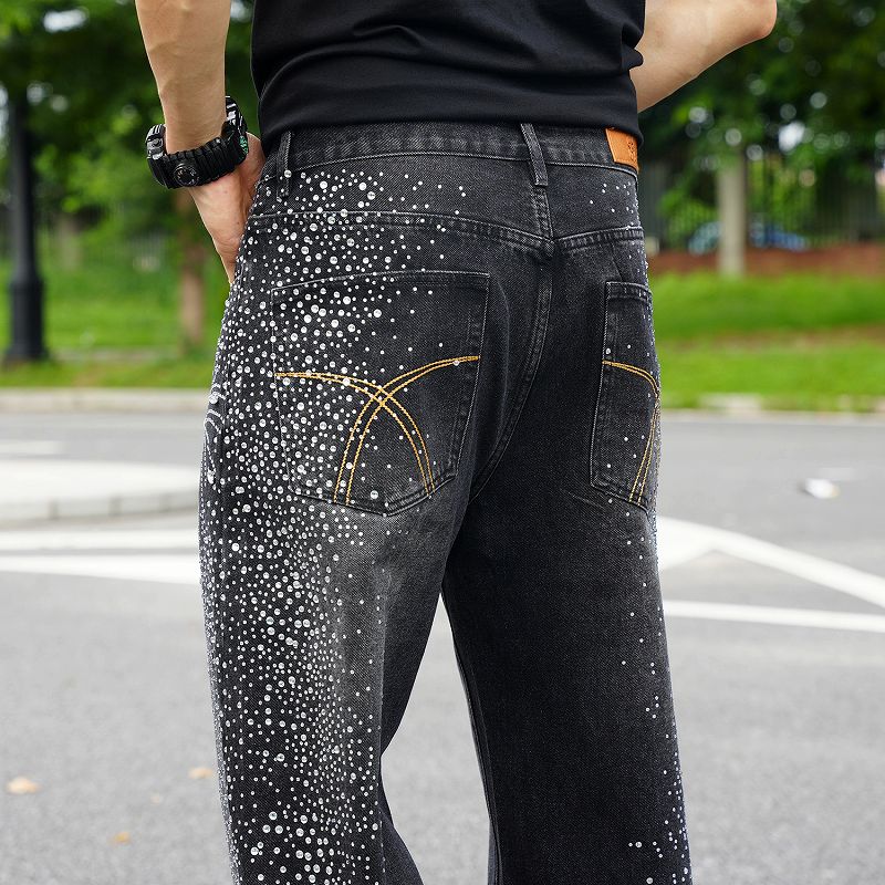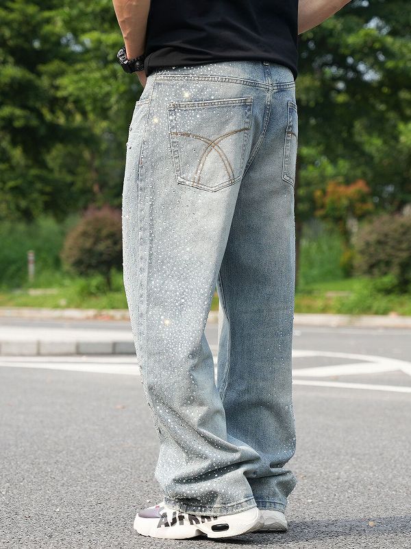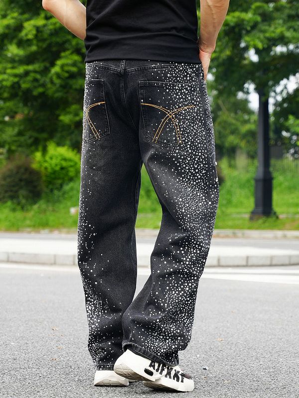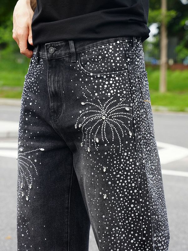 黒地にラインストーンで描かれた花火模様が印象的なデニムパンツ。