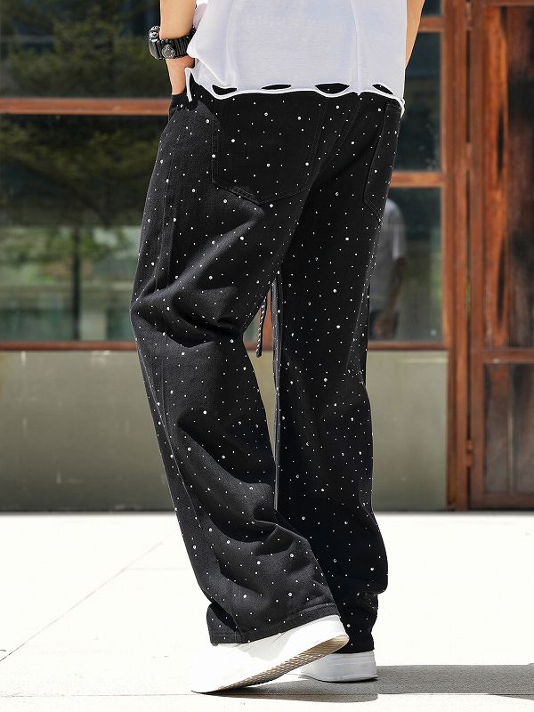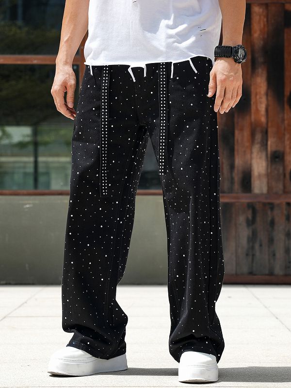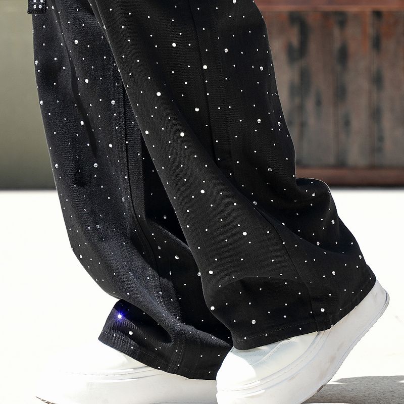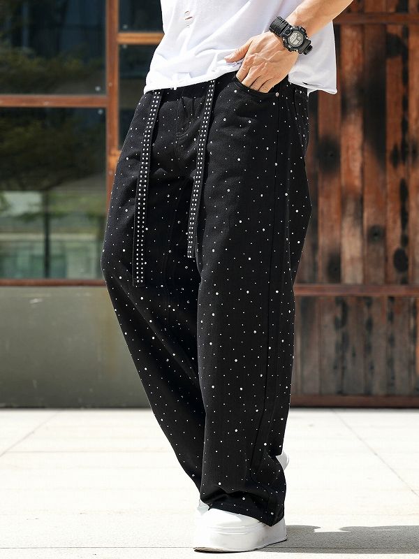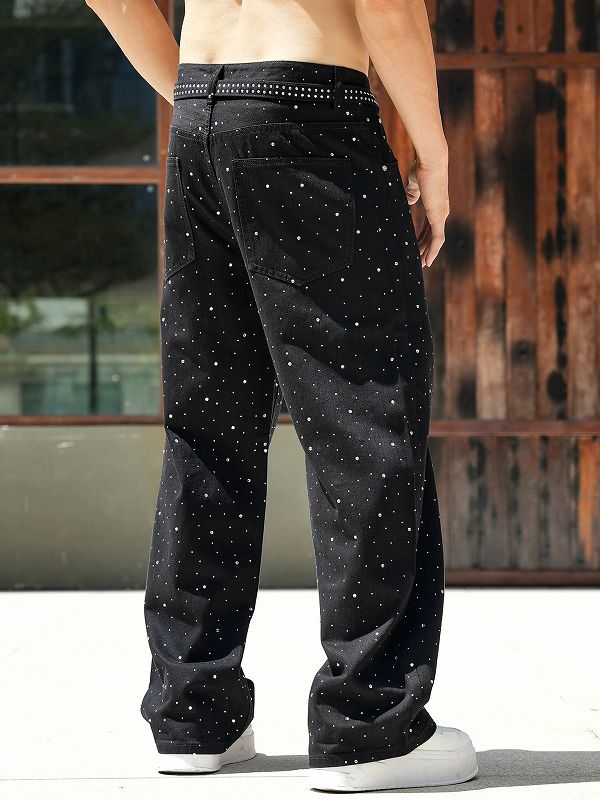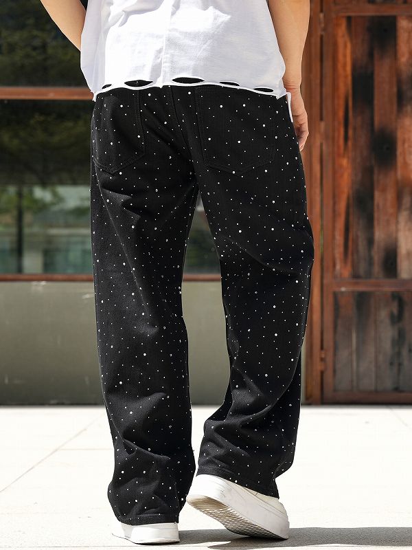 全面に散りばめられたラインストーンが印象的な黒デニムパンツです。