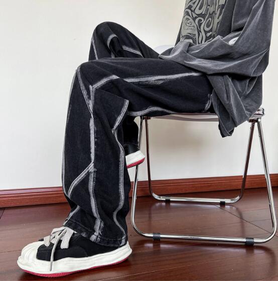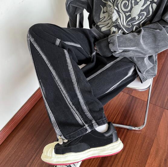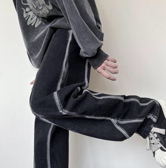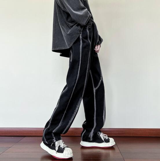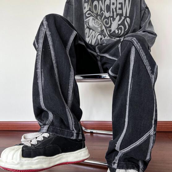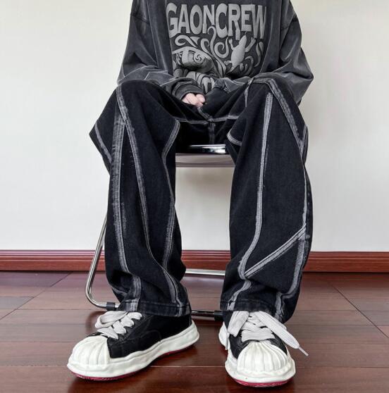 ユニークなステッチデザインが特徴的な黒デニムパンツ。